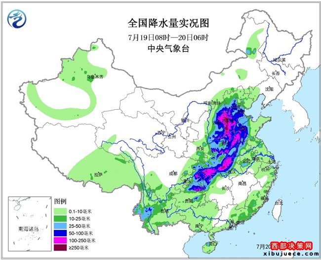 19日,一條強降雨縱貫中東部,山西東部、河北中南部、北京西南部、山東西部、河南北部和南部及湖北中部和西南部、湖南西北部、貴州東北部等地出現(xiàn)大暴雨,河北西南部及河南安陽和南陽、山西陽泉和晉中、湖北荊門、隨州和恩施、貴州銅仁等地部分地區(qū)出現(xiàn)特大暴雨,河北石家莊市平山、井陘和贊皇、邢臺市臨城和內(nèi)邱、邯鄲涉縣和磁縣、河南安陽林州、湖北荊州京山等局地降雨400~616毫米,上述局地1小時最大降雨100~140毫米。