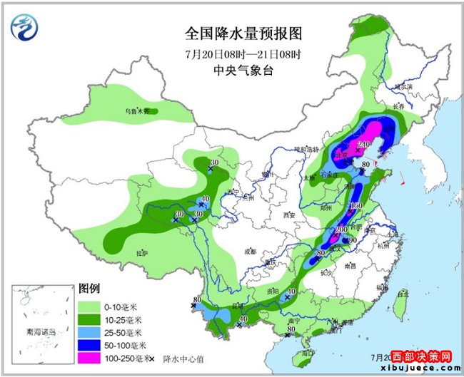 預(yù)計,20日08時至21日08時,湖南北部、湖北中東部、河南東南部、安徽西北部、江蘇西北部、山東中部、河北中東部、北京、天津、遼寧中南部及云南西部、廣西南部沿海等地有暴雨,其中,河北東北部、遼寧西南部、北京中南部、天津北部以及湖北中部偏北、河南東南部、安徽西北部等地的部分地區(qū)有大暴雨(100~240毫米);上述地區(qū)局地并伴有短時強降水、雷暴大風(fēng)等強對流天氣,最大小時雨強50~70毫米,局地可超過80毫米。