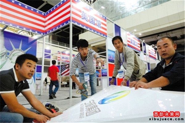 裝修工人進(jìn)行最后的展館裝潢