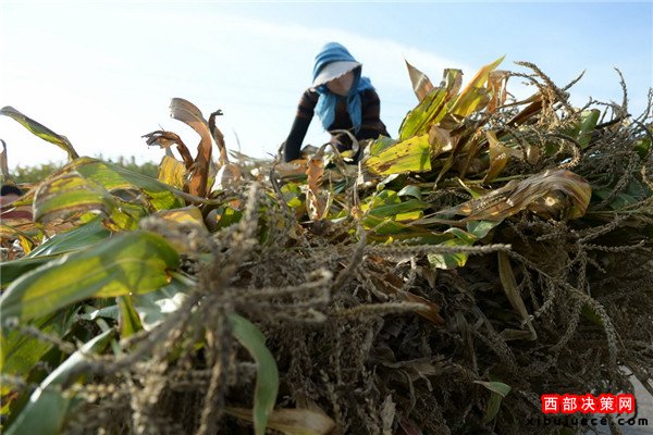9月28日,在定西市隴西縣德興鄉(xiāng)營門村,一位農(nóng)民在清理自家地里已經(jīng)旱死的玉米。