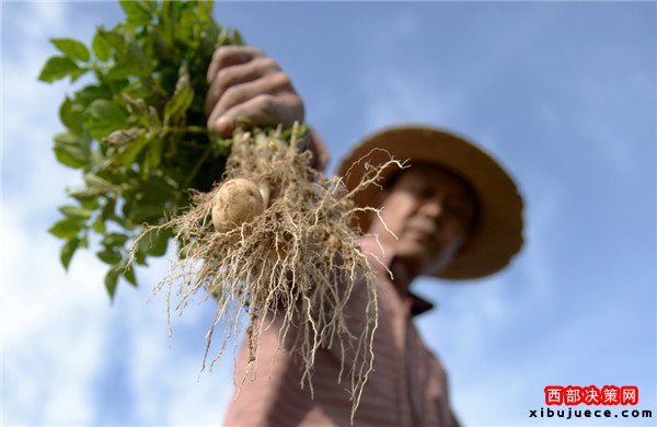 9月28日,在定西市隴西縣德興鄉(xiāng)營門村,一位農(nóng)民展示受旱情影響導致不足雞蛋大小的馬鈴薯。