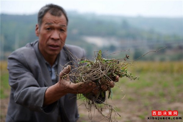 9月28日,定西市渭源縣清源鎮(zhèn)崔家河村,一位農(nóng)民展示從地里挖出來的已經(jīng)旱死的黨參。