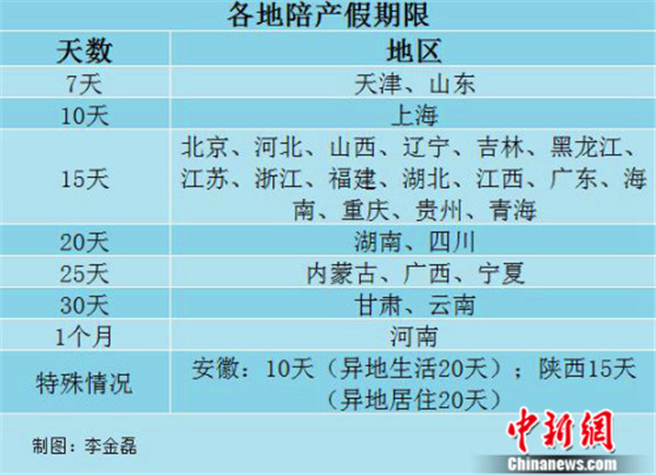 中新網(wǎng)(微信公眾號:cns2012)記者統(tǒng)計發(fā)現(xiàn),目前,除了西藏和新疆外,其余29個省份均相繼修改了本地計生條例,明確了本地的陪產(chǎn)假(部分地區(qū)稱為護理假)的期限。其中,最短的陪產(chǎn)假有7天,最長的則有1個月之久,多數(shù)地區(qū)的陪產(chǎn)假為15天。
