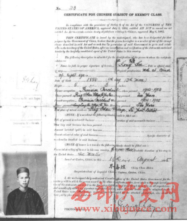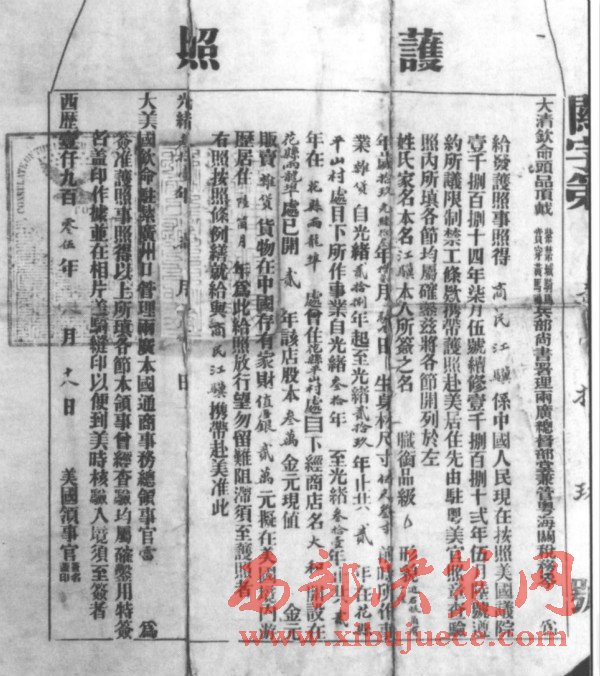 如此看來,他是一位了不起的地方富商。江驥的太和商店主要經(jīng)營雜貨貿(mào)易。因此,他向廣州政府申請(qǐng)去美國游歷,開開眼界。雖然1905年是美國百年排華運(yùn)動(dòng)的高潮年,而且美國政府明令禁止“華工”入境。就在江驥申請(qǐng)游美護(hù)照的前一個(gè)月,中國爆發(fā)了聲勢浩大的抵制美貨運(yùn)動(dòng),其目的就是抗議美國壓迫華僑。但是,美國是允許中國商人入境游歷的,像江驥這樣的廣州富商,更是歡迎。所以,兩廣總督岑春煊會(huì)同美國駐廣州總領(lǐng)事雷伏禮在1905年8月18日分別在江驥的中國護(hù)照了簽名,準(zhǔn)許其赴美游歷。