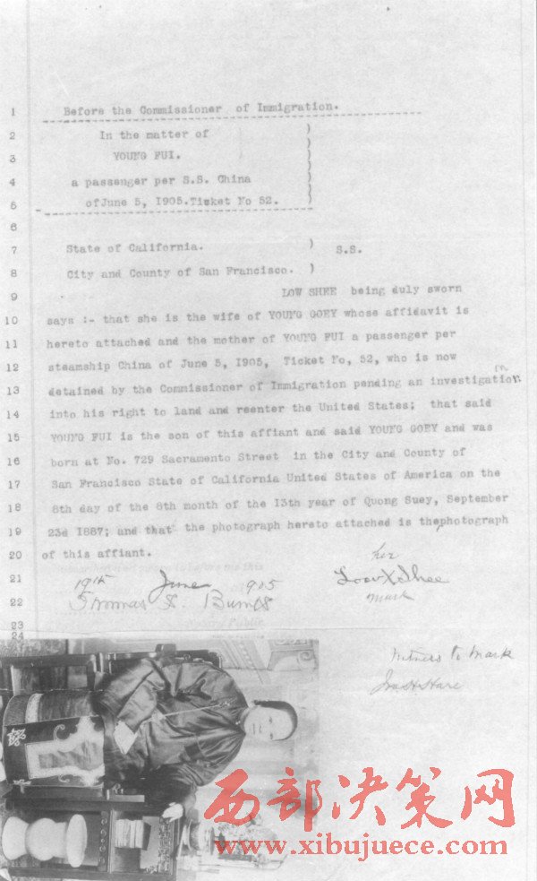 1905年6月5日,美國舊金山移民局官員對(duì)一位中國華僑的婦女入境資格的審查證明