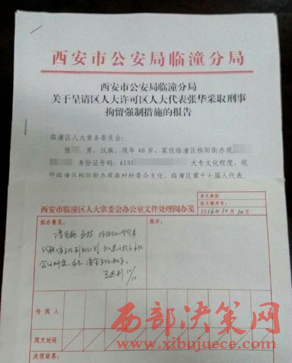 相關(guān)人士向澎湃新聞提供的一份西安市公安局臨潼分局關(guān)于“呈請(qǐng)區(qū)人大許可區(qū)人大代表張華采取刑事拘留強(qiáng)制措施”的報(bào)告顯示,張華,男,家住臨潼區(qū)櫟陽街辦觀高村第六組,現(xiàn)任臨潼區(qū)櫟陽街辦觀高村村委會(huì)主任,臨潼區(qū)第十七屆人大代表。上面還附有西安臨潼區(qū)人大常委會(huì)辦公室文件處理閱辦箋的擬辦意見:“需研究決定”。