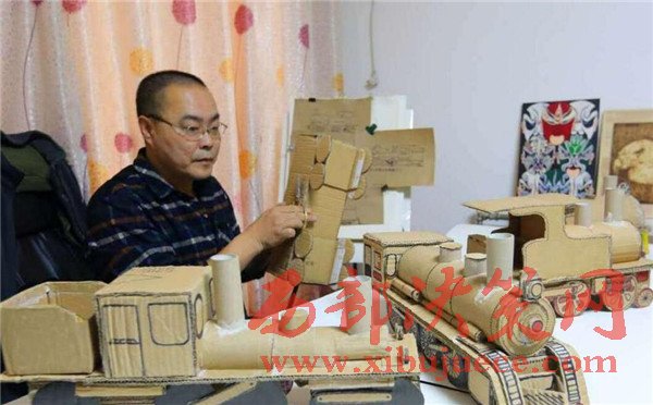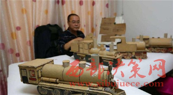 【廢舊紙箱變成精美的老式“蒸汽火車”】廢舊紙箱、紙盒能做什么呢?大多數(shù)人都會把它當(dāng)成廢品賣掉了,而市民王小龍卻變廢為寶地將其制作成了4個(gè)精美的老式“蒸汽火車”。11月20日,記者來到丈八北路附近的王小龍家中,剛下班的他顧不上休息,已經(jīng)在工作臺前做起微型“蒸汽火車”的車廂,已經(jīng)做好的4個(gè)微縮版的老式“蒸汽火車”醒目地?cái)[在桌子上,讓人眼前一亮。這些“蒸汽火車”全是用廢舊的紙箱、紙盒手工制作,司機(jī)室、鍋爐、煙囪、大燈、車輪等,樣樣都有。