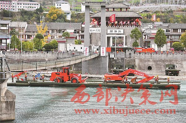 11月22日,聯(lián)合應(yīng)急演練中,我國自主研制的動力舟橋在平武縣南壩鎮(zhèn)穿過鐵索橋。