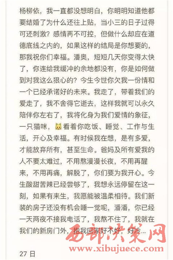 次日凌晨1點20分,段丹峰在朋友圈發(fā)布長文,表達因感情問題意欲輕生,并配有一張與潘奧相擁的親密合影。在朋友圈中,段丹峰寫道,潘奧有新歡楊某,短短幾 天變化太快,沒有給她留下緩沖的余地,潘奧已經(jīng)一天兩夜沒接她電話,自己此刻正在新房外。據(jù)段丹峰朋友介紹,與潘奧的合影正是今年9月初,兩人去給朋友當 伴郎伴娘,在別人婚禮上,潘奧曾向她求婚。