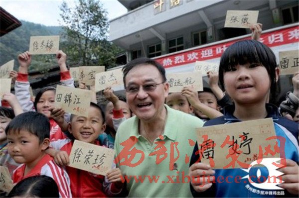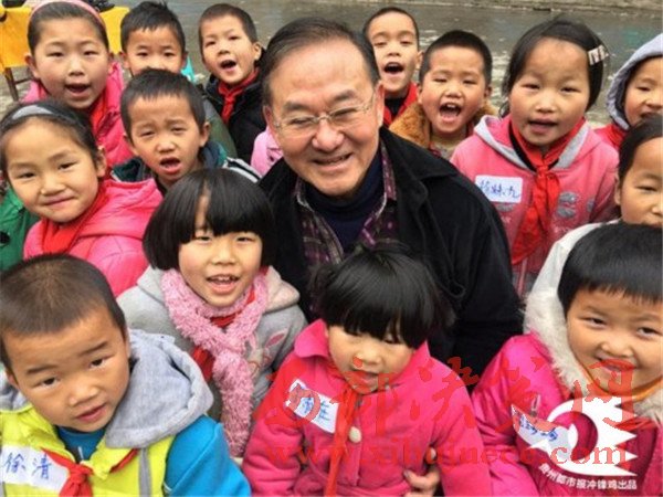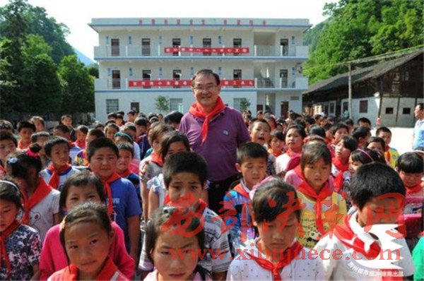 (2013年,葉其超到遵義市務(wù)川縣涪洋鎮(zhèn)雙河小學(xué)看望學(xué)生,他們身后的新樓是葉其超捐款50萬(wàn)元援建的希望食堂、宿舍。)