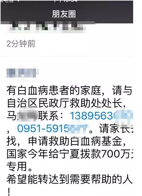 3日開始,該微信在多個(gè)朋友圈中刷屏,還公布了工作人員的手機(jī),當(dāng)天,多個(gè)網(wǎng)友撥打該手機(jī)申請(qǐng)或詢問是否能申請(qǐng)救助白血病基金。“剛開始還一頭霧水,后來看到了同事轉(zhuǎn)發(fā)給我的朋友圈截圖,才明白過來。”