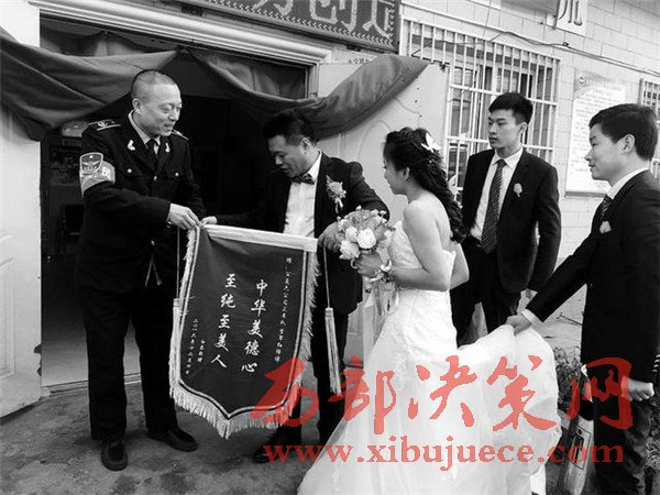 12月4日上午,一輛婚車突然開進(jìn)西安市辛家廟公交樞紐站,新郎白磊和新娘房佳歡將一面寫有“中華美德心至純至美人”字樣的錦旗,送到了211路司機(jī)李軍紅手中,這一新鮮場面頓時(shí)引起了眾人圍觀。