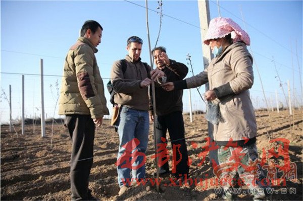 12月8日上午8時30分,淳化縣卜家鎮(zhèn)蔣家山村,當(dāng)?shù)毓r(nóng)剛吃完早飯,林東已從100多公里外的西安趕到這里,他一邊用熟練的中文問大家“咥飽了沒有”,一邊從背包里掏出果樹剪刀,走進(jìn)地里查看樹苗的過冬情況。果園的技術(shù)員拿個大本子跟在林東后邊做記錄,遇到難點(diǎn)林東就親自示范。