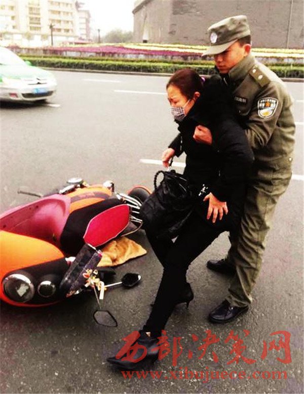 昨天17時10分,碑林區(qū)城市管理局柏樹林中隊執(zhí)法隊員馬奔和張翼在鐘樓開元商城區(qū)域正常開展巡查時,突然看見一名中年女子騎著電動車路過鐘樓十字右拐過程中,被一輛轎車撞了一下,緊接著,騎車的中年女子連人帶車倒在地上,肇事車輛當場逃逸。