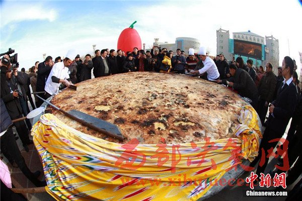 據(jù)悉,庫麥其是維吾爾族傳統(tǒng)美食,又稱且末“大披薩”,用300公斤面粉、200公斤羊肉、60公斤洋蔥,花費(fèi)4個半小時制成,直徑達(dá)3.65米,寓意一年365天,天天有肉馕吃。圖為廚師忙著為游客切“最大的庫麥其”。