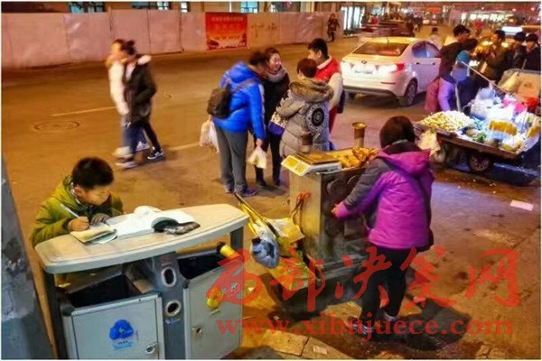攤位旁,張女士的兒子正趴在垃圾桶上認(rèn)真地寫作業(yè)。這一幕,經(jīng)常會發(fā)生在青島臺東大酒店附近。附近許多商販都知道“路邊賣烤地瓜那家”的兒子學(xué)習(xí)很用功,也特別懂事,經(jīng)常幫母親收拾貨物,照看攤位。