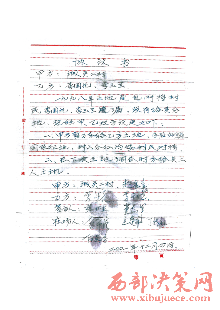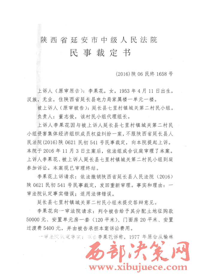 附:延安市中級(jí)人民法院民事裁定書(shū)和七里村鎮(zhèn)和城關(guān)二村李果花的協(xié)議書(shū)。