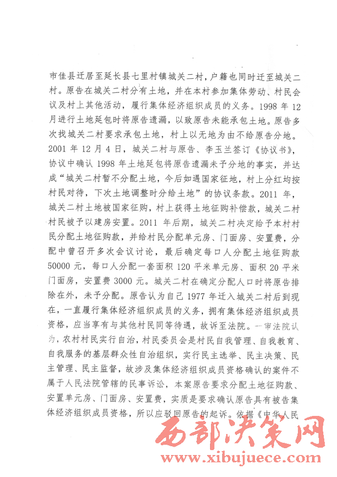 西部決策網(wǎng)訊(記者 封營(yíng)庫(kù) 實(shí)習(xí)記者 李延梅)陜西延長(zhǎng)縣七里村村民李果花反映稱(chēng):“1977年我從榆林市佳縣遷居至延長(zhǎng)縣七里村鎮(zhèn)城關(guān)二村,戶籍也同時(shí)遷至城關(guān)二村。我在城關(guān)二村分有土地,并在本村參加集體勞動(dòng)村民會(huì)議及村上其它活動(dòng),履行集體經(jīng)濟(jì)組織成員的義務(wù)。1998年12月進(jìn)行土地延包時(shí)將我遺漏,以致我未能承包土地。我多次找城關(guān)二村要求承包土地,村上以無(wú)地為由不給我分地。2001年12月4日,城關(guān)二村與我、李玉蘭簽訂《協(xié)議書(shū)》,協(xié)議中確認(rèn)1998年土地延包時(shí)將我遺漏未有分地的事實(shí),并達(dá)成“城關(guān)二村暫不分配土地,今后如遇國(guó)家征地,村上分紅均按村民對(duì)待,下次土地調(diào)整時(shí)分給土地”的協(xié)議條款。2011年,城關(guān)二村土地被國(guó)家征購(gòu),村上獲得土地征購(gòu)補(bǔ)償款,城關(guān)二村村民被予以建安置房。2011年后期,城關(guān)二村決定給予本村村民分配土地征購(gòu)款,并給村民分配單元房、門(mén)面房、安置費(fèi),分配中曾召開(kāi)多次會(huì)議討論,最后確定每口人分配土地征購(gòu)款50000元,每口人分配一套面積120平米單元房,面積20平米的門(mén)面房,安置費(fèi)5000元,城關(guān)二村在確定人口時(shí)將我排除在外,未予分配。我認(rèn)為自己1977年遷入城關(guān)二村后到現(xiàn)在,一直履行集體經(jīng)濟(jì)組織成員的義務(wù),擁有集體經(jīng)濟(jì)組織成員資格,應(yīng)當(dāng)享有與其他村民同等待遇,故訴至延長(zhǎng)縣人民法院要求判令城關(guān)二村給予我分配土地征購(gòu)款50000元,安置單元房一套(120平米)、門(mén)面房20平米,安置過(guò)渡費(fèi)5400元。但被延長(zhǎng)縣人民法院以涉及集體經(jīng)濟(jì)組織成員資格的案件不屬于人民法院管轄的民事訴訟,駁回起訴。我又上訴至延安市中級(jí)人民法院,但又用同樣的理由又被駁回上訴。我該怎么辦?真的天下烏鴉一般黑嗎?我訴訟的是要回屬于我的征地款、安置房、過(guò)渡費(fèi),我有合法的戶口簿、身份證。又有延長(zhǎng)縣城關(guān)鎮(zhèn)政府副鎮(zhèn)長(zhǎng)張世杰、包村片長(zhǎng)趙華強(qiáng)、包村干部白醫(yī)學(xué)、城關(guān)村村主任(二村村民)董志軍、二村村長(zhǎng)趙金星,原二村會(huì)計(jì)王連平,原二村代表老村長(zhǎng)丁興元,在鎮(zhèn)政府會(huì)議室簽訂的協(xié)議書(shū)。難道我的村民資格還要確認(rèn)嗎?我村村長(zhǎng)董志軍的兒子董飛戶口也不在我村,又是公務(wù)員,現(xiàn)任延長(zhǎng)縣紀(jì)律檢查委員會(huì)案件審理室主任,還有村長(zhǎng)董志軍他父親。董長(zhǎng)春早已去世,但也同樣分的征地補(bǔ)償款,安置單元房,安置過(guò)渡費(fèi)。望你們新聞媒體深入調(diào)查,將事實(shí)公布于眾,為我申冤,維護(hù)我的合法權(quán)益。”