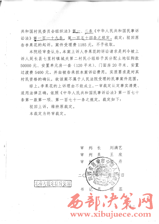 記者又多次翻閱了延長(zhǎng)縣人民法院(2016)陜0621號(hào)民初541號(hào)民事裁定書(shū)和延安市中級(jí)法院(2016)陜06民終1658號(hào)民事裁定書(shū),兩級(jí)法院都用同樣的理由是:“李果花的訴訟請(qǐng)求是判令被上訴人延長(zhǎng)縣七里村鎮(zhèn)城關(guān)二村民小組給予其分配土地征購(gòu)款50000元,安置單元房一套(120平米),門(mén)面房20平米,安置過(guò)渡費(fèi)5400元,并由被告承擔(dān)案件訴訟費(fèi)用,實(shí)質(zhì)要求是對(duì)其村民資格的確認(rèn),故該案不屬于人民法院受理的民事案件范圍。”一審法院駁回起訴,二審法院是駁回上訴,維持原判。正如反映人李果花稱(chēng):“我訴訟的是要回我合法的土地征購(gòu)款、安置房、門(mén)面房、安置過(guò)渡費(fèi)。村民的資格確認(rèn),我有的合法的戶口簿、身份證,又有鎮(zhèn)政府領(lǐng)導(dǎo)、村干部、村民代表的協(xié)議書(shū)還不夠嗎?”