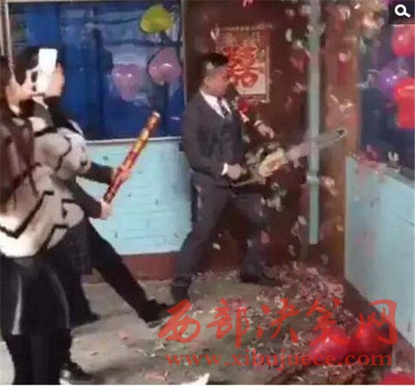 伴娘擋在門前,向新郎要紅包,一定要數(shù)目夠大才肯開門。現(xiàn)場(chǎng)的伴郎團(tuán)把伴娘拉下去,新郎撿起了地上的一把電鋸,這是要干什么呢?