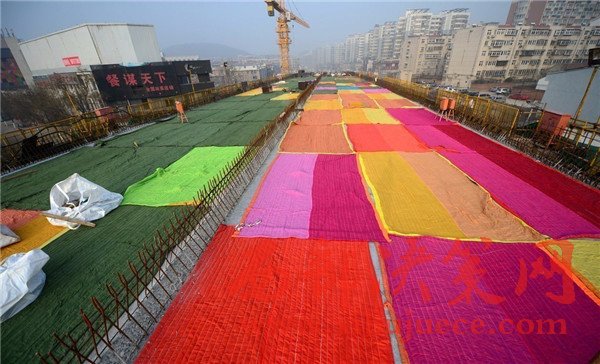 2017年1月2日,濟南,在七里山路附近的順河高架橋南延施工現(xiàn)場,百余米長的高架橋路面鋪設(shè)了彩色的棉被,總數(shù)達(dá)到100多條,覆蓋面積約2000多平方米 。據(jù)了解,該段高架橋為新澆筑的箱梁,為確保冬季低溫下混凝土能夠保證強度和防凍,施工采取多種保暖法,為路面蓋棉被取暖。