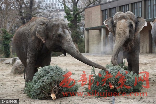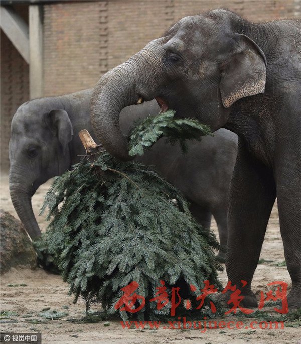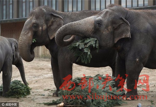 當?shù)貢r間2017年1月3日,德國柏林,Zoologischer Garten動物園的大象們食用“圣誕樹”美食大餐。