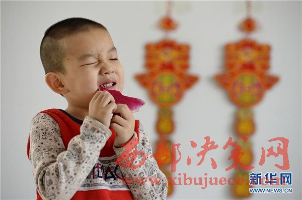 2月3日,河北省邢臺(tái)市橋東區(qū)三義廟社區(qū)的兒童在社區(qū)兒童娛樂室吃蘿卜“咬春”。