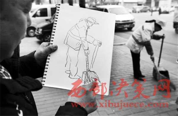 昨天下午,記者見到李福昌,他拿起素描本和記者一起出了門,家門口永新路上,一名保潔員打開道沿邊的垃圾桶,拎出內(nèi)膽,將垃圾倒進(jìn)清運車。李福昌靜靜站在10米開外的地方,打開本子拿起筆,寥寥幾筆就將一位正在掃地的保潔員生動形象地勾勒出來。他沒有上前打擾保潔員,保潔員也沒有發(fā)現(xiàn)他。隨后,他又來到大興路、西二環(huán),保潔員忙碌的身影都被他一一收入畫中。