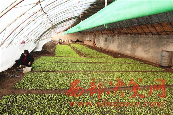 在王磊家的大棚內(nèi),滿眼的綠色郁郁蔥蔥,棚內(nèi)大約培育了十萬余株蔬菜幼苗,有萵筍、蓮花白,棚里光線充足,空氣濕潤,室內(nèi)溫度高達零上26攝氏度,為菜苗提供了良好的生長條件。隨處可見農(nóng)民忙碌的身影,有的在移苗,有的在為營養(yǎng)袋裝土,有的在裝穴盤,動作嫻熟、井井有條。