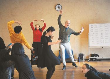 茲維卡(右)指導學員伴隨著音樂的節(jié)拍進行舞動。