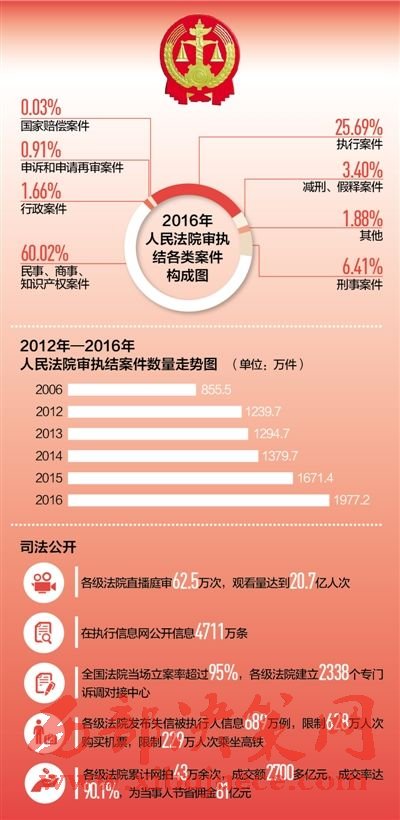 2016年,各級法院向執(zhí)行難全面宣戰(zhàn),共受理執(zhí)行案件614.9萬件,執(zhí)結(jié)507.9萬件,同比分別上升31.6%和33.1%,執(zhí)行到位金額1.5萬億元,同比上升54%。與公安部等10多個部門建立網(wǎng)絡執(zhí)行查控系統(tǒng),執(zhí)行法官足不出戶即可依法查詢被執(zhí)行人財產(chǎn)和相關信息,實現(xiàn)了執(zhí)行模式的根本變革。發(fā)布失信被執(zhí)行人信息689萬例,限制628萬人次購買機票,限制229萬人次乘坐高鐵。依法懲治拒不執(zhí)行裁判行為,司法拘留1.6萬人,追究刑事責任2167人,讓司法裁判真正成為懲治違法失信的利劍。