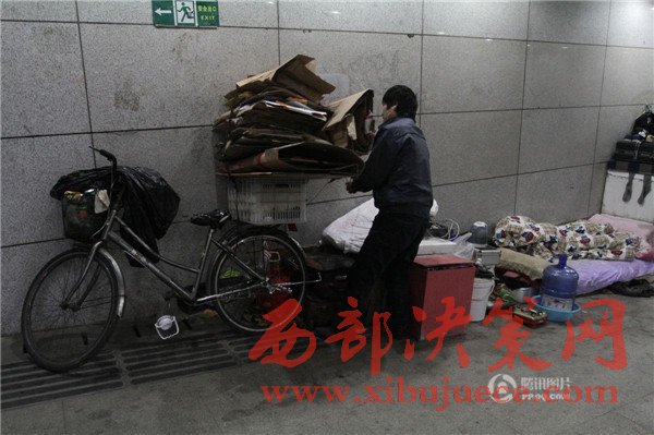 2016年11月27日,湖北武漢,10個(gè)流浪漢生活的中南財(cái)大地下通道,有床鋪、廚房、座椅、掛鐘、鏡子、自行車、取水處等,每天掃地,定期拖地,干凈整潔,儼然是一個(gè)溫馨家園。