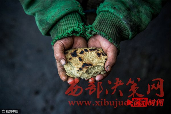我看到孩子啃這塊玉米面餅的時(shí)候,應(yīng)該已經(jīng)放了好幾天了。我用手掰了一下,沒(méi)有成功,卻沾了一手的灰土。