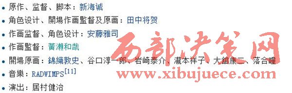 著名作畫監(jiān)督安藤雅司,擔(dān)任過《千與千尋》、《紅辣椒》、《東京教父》的作畫監(jiān)督。安騰雅司主要負(fù)責(zé)身體互換之后人物表現(xiàn)的變化。他將三葉與瀧靈魂互換時(shí)的害羞與困惑表現(xiàn)得淋漓盡致,還增添了新海誠作品中少有的喜劇色彩。而最能體現(xiàn)安藤功力的橋段是故事高潮的一幕——少女三葉和少年瀧奔跑著尋找彼此,他們只是在畫面上奔跑,就能讓人有一種強(qiáng)烈的情感似乎要從銀幕上溢出來的感覺。