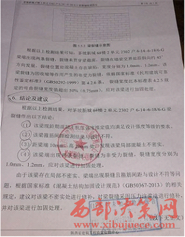 最早有兩戶村民投訴舉報(bào),小區(qū)的物業(yè)公司出資委托陜西省建筑工程質(zhì)量檢測(cè)中心進(jìn)行鑒定,結(jié)論如下: