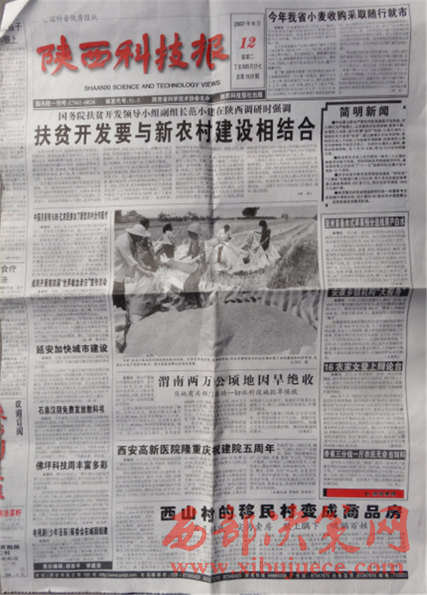 后附:2007年6月12日刊登稿件的陜西科技報(bào)一張。