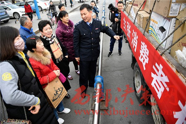 3月14日,銀川市市場監(jiān)督管理局工作人員向市民介紹假冒偽劣商品的危害和辨識(shí)方法。