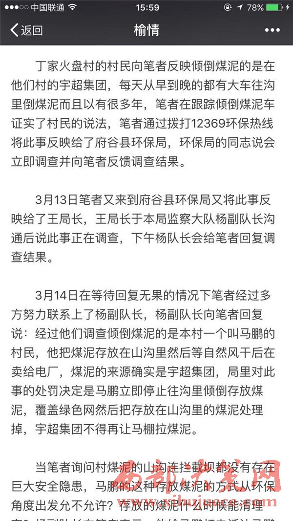 3月14日在等待回復(fù)無(wú)果的情況下筆者經(jīng)過(guò)多方努力聯(lián)系上了楊副隊(duì)長(zhǎng),楊副隊(duì)長(zhǎng)向筆者回復(fù)說(shuō):經(jīng)過(guò)他們調(diào)查傾倒煤泥的是本村一個(gè)叫馬鵬的村民,他把煤泥存放在山溝里然后等自然風(fēng)干后在賣給電廠,煤泥的來(lái)源確實(shí)是宇超集團(tuán),局里對(duì)此事的處罰決定是馬鵬立即停止往溝里傾倒存放煤泥,覆蓋綠色網(wǎng)然后把存放在山溝里的煤泥處理掉,宇超集團(tuán)不得再讓馬棚拉煤泥。