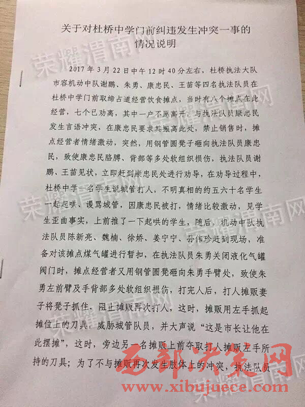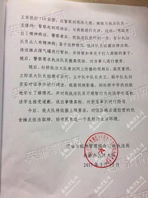 當(dāng)晚6點(diǎn)以后,涉事執(zhí)法隊(duì)員所屬執(zhí)法大隊(duì)杜橋執(zhí)法大隊(duì)書面回復(fù)便在網(wǎng)絡(luò)中被網(wǎng)友們不斷的轉(zhuǎn)載。據(jù)該回復(fù)稱:2017年3月22日中午12時(shí)40分左右,杜橋執(zhí)法大隊(duì)市容機(jī)動(dòng)中隊(duì)謝鵬、朱勇、康忠民、王苗等4名執(zhí)法隊(duì)員在杜橋中學(xué)門前取締占道經(jīng)營飲食攤點(diǎn),當(dāng)時(shí)有八個(gè)攤點(diǎn)在此經(jīng)營,七個(gè)已勸離,其中一戶不愿離開,與執(zhí)法隊(duì)員康忠民發(fā)生言語沖突,在康忠民要求其搬離此處,禁止銷售時(shí),攤點(diǎn)經(jīng)營者情緒激動(dòng),突然,用鋼管圓凳子砸向執(zhí)法隊(duì)員康忠民,致使康忠民胳膊、背部等多處軟組織損傷,執(zhí)法隊(duì)員謝鵬、王苗等見狀,立即趕到康忠民處進(jìn)行勸導(dǎo),在勸導(dǎo)過程中,杜橋中學(xué)一名學(xué)生說城管打人,不明真相的約五六十名學(xué)生一起起哄、謾罵城管,因康忠民被打,情緒比較激動(dòng),見學(xué)生歪曲事實(shí),上前推了一下起哄的學(xué)生,隨后,機(jī)動(dòng)中隊(duì)執(zhí)法隊(duì)員朱勇、陳新亮、魏楠、徐嬌、姜寧寧、孫偉珍趕到現(xiàn)場,準(zhǔn)備對(duì)該攤點(diǎn)煤氣罐進(jìn)行暫扣,在執(zhí)法隊(duì)員朱勇關(guān)閉液化氣罐閥門時(shí),攤點(diǎn)經(jīng)營者用鋼管圓凳砸向朱勇手臂處,致使朱勇左前臂及手背部多處軟組織損傷,打完人后,打人攤販妻子將凳子抓住,阻止攤販再次打人,這時(shí),攤販用左手抓起攤位上的刀具,威脅城管隊(duì)員,并大聲說“這是市長讓他在此擺攤”,這時(shí),旁邊另一名攤販上前奪取打人攤販左手所持的刀具;為了不與攤販再次發(fā)生肢體上的沖突,執(zhí)法隊(duì)員王苗撥打110報(bào)警,在警察到現(xiàn)場之前,攤販與執(zhí)法隊(duì)員一直僵持;警察趕到現(xiàn)場后,與商販進(jìn)行交涉,這時(shí),商販亮出了精神病證,警察看后,把執(zhí)法隊(duì)員叫到一旁,告知執(zhí)法隊(duì)員此人有精神??;鑒于這種情況,執(zhí)法隊(duì)員依據(jù)法律法規(guī),將該攤點(diǎn)煤氣罐進(jìn)行暫扣,并將暫扣單交于打人商販的妻子,隨后,警察要求執(zhí)法隊(duì)員撤離現(xiàn)場,對(duì)當(dāng)事人進(jìn)行教育。