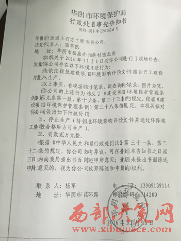 一份2016年11月23日《華陰市環(huán)境保護(hù)局行政處罰決定書》復(fù)印件顯示,環(huán)保局于2016年11月1日對該公司進(jìn)行了現(xiàn)場檢查,發(fā)現(xiàn)該公司存在未依法報批建設(shè)項目環(huán)境影響評價文件擅自開工建設(shè)并投入生產(chǎn)。處罰是停止生產(chǎn)和罰款2萬元。