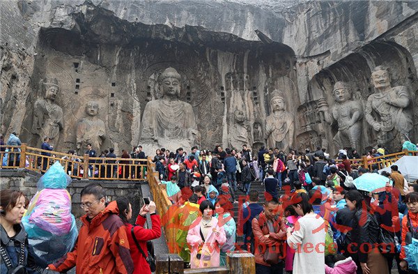 4月4日,游客冒雨游覽河南洛陽龍門石窟。