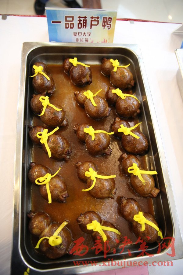 在長(zhǎng)達(dá)數(shù)個(gè)小時(shí)的比賽中,來自37所上海高校的100多位廚師輪流上陣,共制作出菜品111個(gè)。圖為復(fù)旦大學(xué)一品葫蘆鴨。