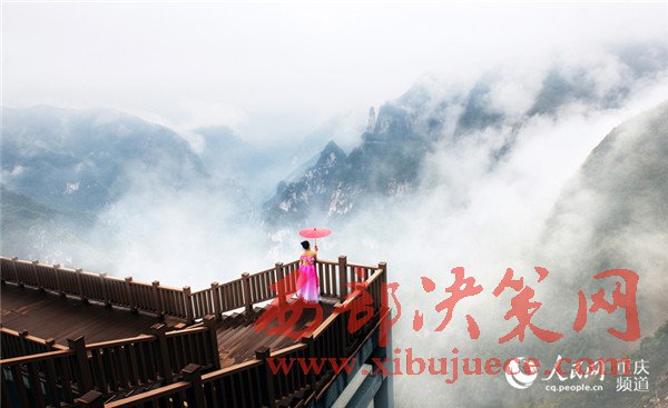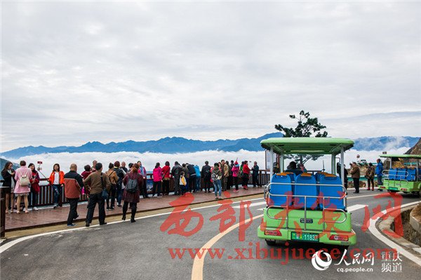 圖為游客在觀景臺(tái)觀賞巫山云霧。