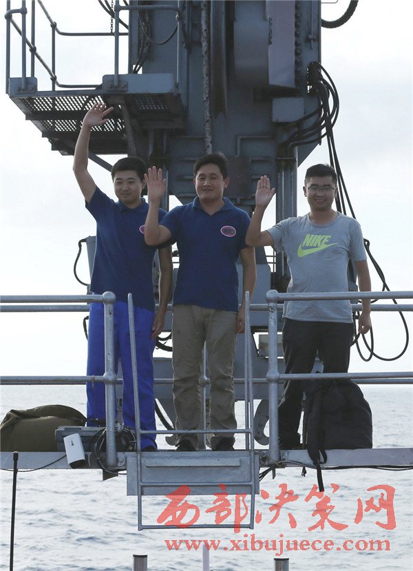 5月10日,科學(xué)家鹿博、主駕駛員齊海濱(中)和副駕駛員陳云賽(右)下潛歸來。