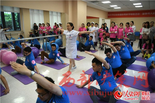 準(zhǔn)爸爸們體驗(yàn)孕婦瑜伽,幾分鐘后,不少人累得氣喘吁吁。
