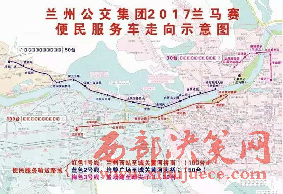 2號(hào)接送專線:賽事當(dāng)天早4:40時(shí)開(kāi)始至6:30結(jié)束(路橋封閉之前),由培黎廣場(chǎng)始發(fā),不間斷開(kāi)往北濱河路城關(guān)黃河大橋,途經(jīng):十里店、幸福巷、七里河黃河橋北、羅九公路、公交廣告、北濱河中路、龍?jiān)?、金城關(guān)、白塔山公園、市二院、音樂(lè)噴泉、城關(guān)黃河大橋(折返),該線路配車50臺(tái)。