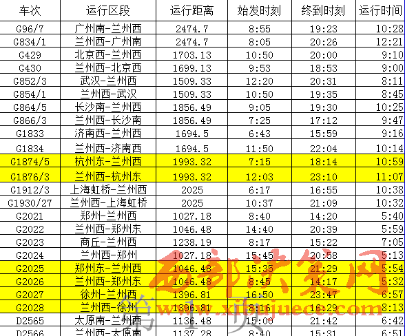 從寶蘭高鐵列車開行方案來看,蘭州西至北京西開行動車組列車1對,為列車雙向對開,共計運行1699公里,9:53從蘭州西站始發(fā),18:53達到北京西站,車次為 G430次,運行時間9小時整;10:50從北京西站始發(fā),20:00到達蘭州西站,車次為 G429次。蘭州西至廣州南開行動車組列車1對,為列車雙向對開,共計運行2474.7公里,8:05從蘭州西站始發(fā),20:26到達廣州南站,車次為 G834/1次;8:55從廣州南站始發(fā),19:23到達蘭州西站,車次為 G96/7次,運行時間10小時28分。蘭州西至上海虹橋站開行動車組列車1對,為列車雙向對開,共計運行2025公里,10:37從蘭州西站始發(fā),21:09到達上海虹橋站,車次為 G1930/27次,運行時間10小時32分;6:17從上海虹橋站始發(fā),16:55到達蘭州西站,車次為 G1912/3次。
