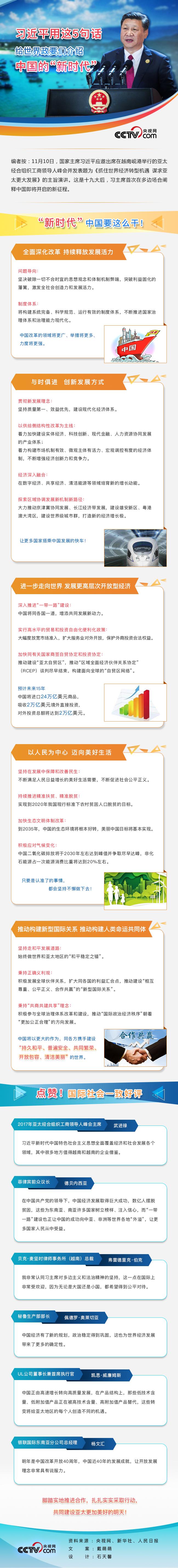 11月10日,國(guó)家主席習(xí)近平應(yīng)邀出席在越南峴港舉行的亞太經(jīng)合組織工商領(lǐng)導(dǎo)人峰會(huì)并發(fā)表題為《抓住世界經(jīng)濟(jì)轉(zhuǎn)型機(jī)遇 謀求亞太更大發(fā)展》的主旨演講。這是十九大后,習(xí)主席首次在多邊場(chǎng)合闡釋中國(guó)即將開(kāi)啟的新征程。