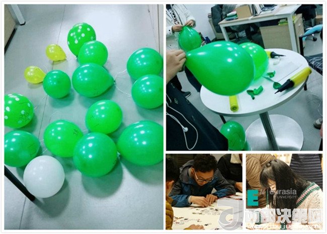 土豆和西紅柿根本就不是一個(gè)世界的,但它們走到了一起,變成了薯?xiàng)l和番茄醬它倆就是絕配;學(xué)籍制度和競(jìng)技運(yùn)動(dòng)也不是一個(gè)世界的,但它們?nèi)诤显诹艘黄?,變成了頭腦風(fēng)暴和趣味運(yùn)動(dòng)它們也可以很般配,現(xiàn)在就讓我們來看看它們是怎么融合的……聽那陣陣氣球爆炸的聲音,他們開始了!在這些綠油油的氣球中有事先設(shè)置的題目隊(duì)員們要先擠爆氣球答完題才能得到下一個(gè)地方的線索,“補(bǔ)考成績(jī)不合格以及成績(jī)低于50分必須怎樣?”“本科選修課學(xué)分不得低于多少學(xué)分?”這些題是不是還要開動(dòng)腦袋瓜仔仔細(xì)細(xì)的想想才有答案呢?在比賽的現(xiàn)場(chǎng)一秒都會(huì)和對(duì)手拉開差距,容不得一絲猶豫拿到線索的隊(duì)員們又奔向下一個(gè)地點(diǎn)熟悉的教室,這里也不是那么容易通過,看著黑板上的題“冰怎么很快的化成水?”“可替代大學(xué)英語四級(jí)成績(jī)的考試有哪些?”哦,還有計(jì)算題,隊(duì)員們必須腦洞大開,腦細(xì)胞飛速運(yùn)轉(zhuǎn),做學(xué)霸那也是不容易的。只見黑板上粉筆一起一落,答題完畢,看看線索迅速趕往下一地點(diǎn)——地中海。這里指壓板、跳繩早已準(zhǔn)備好等著隊(duì)員們,學(xué)霸不能只管學(xué)習(xí)身體素質(zhì)也很重要,動(dòng)起來吧!在指壓板上跳繩,誰想出來的?忍受著腳底的疼痛還要揮動(dòng)跳繩?太受虐,但是我們是一群不屈不撓的新一代,指壓板上跳繩我們也是鏗鏘有力、一絲不茍。終于結(jié)束痛并快樂著的跳繩環(huán)節(jié),卻看到了整整400塊的拼圖,這個(gè)環(huán)節(jié)真是讓人又愛又恨,還記得兒時(shí)玩拼圖的快樂,但在這激烈的競(jìng)爭(zhēng)環(huán)境下,卻是讓人有點(diǎn)心慌和畏懼。隊(duì)員們最終齊心協(xié)力戰(zhàn)勝了它,細(xì)心、耐心的逐一完好的拼完了每一副圖。