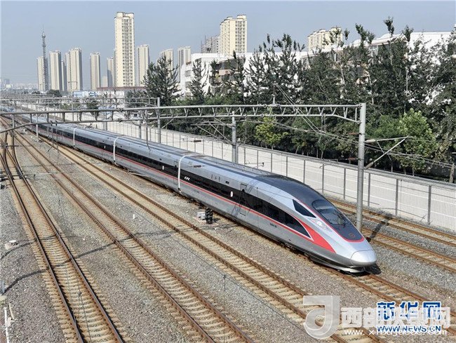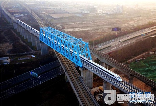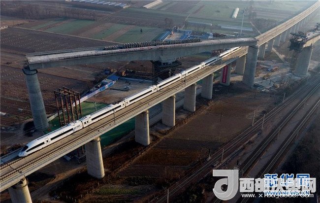 西成高鐵由西安北站駛出的列車經(jīng)過西成高鐵跨西寶高鐵特大橋(12月6日攝)。12月6日,西安至成都高速鐵路全線開通運營,兩地的最短旅行時間壓縮至4小時7分。